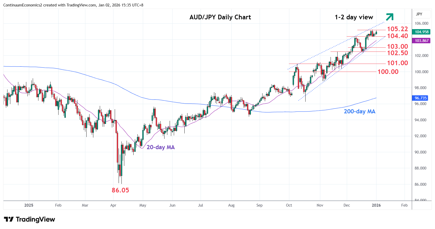07:35 GMT - Consolidation at the 104.40 support see pressure returning to the upside to retest the 105.22, December 2025 year high. Bullish price action highlights scope for break to further extend gains from the April 2025 year low. Clearance will see room for extension to the 106.00/107.00 congestion area. However, overbought daily and weekly studies caution corrective pullback within the rising wedge pattern. Would take break of support at the 104.40/104.00 area to open up room for deeper pullback to strong support at the 103.00 congestion and 102.50/00 area.
