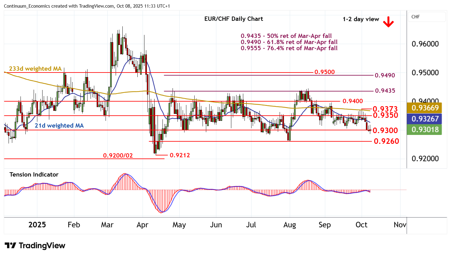 11:05 BST - Little change, as choppy prices extend pressure on congestion support at 0.9300. Daily readings continue to point lower, and broader weekly charts are also under pressure, highlighting room for further losses in the coming sessions. A close below 0.9300 will add weight to sentiment and extend mid-August losses towards 0.9260. Meanwhile, resistance remains at congestion around 0.9350 and should cap any immediate tests higher.