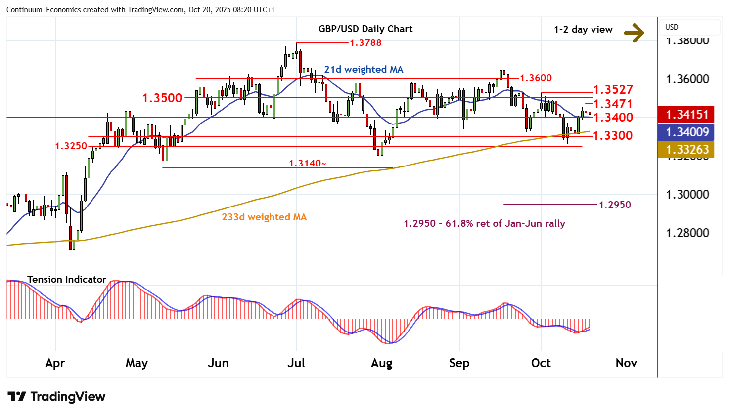 08:10 BST - The anticipated pullback from the 1.3471 weekly high of 17 October has reached congestion support at 1.3400, where short-term consolidation is developing. Intraday studies are under pressure, highlighting room for a test beneath here. But rising daily stochastics and the improving daily Tension Indicator are expected to limit any break in renewed buying interest above further congestion around 1.3300. Meanwhile, a break above 1.3471, if seen, will open up resistance at congestion around 1.3500 and the 1.3527 weekly high of 1 October. However, mixed weekly charts should limit any initial tests of this range in fresh consolidation.