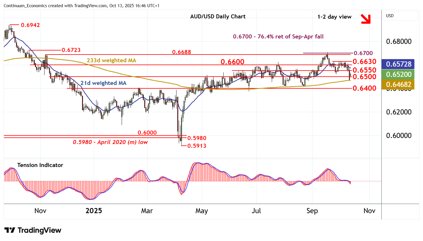 16:40 BST - Anticipated losses have extended below 0.6500 to reach 0.6470, before bouncing into consolidation above 0.6500. Daily readings continue to deteriorate and broader weekly charts are under pressure, suggesting room for fresh losses in the coming sessions. A fresh break below 0.6500 will add weight to sentiment and open up stronger support at further congestion around 0.6400. Oversold daily stochastics could limit any initial tests in consolidation. Meanwhile, resistance is lowered to congestion around 0.6550. A break above here would help to stabilise price action and give way to consolidation beneath the 0.6600/30 range.