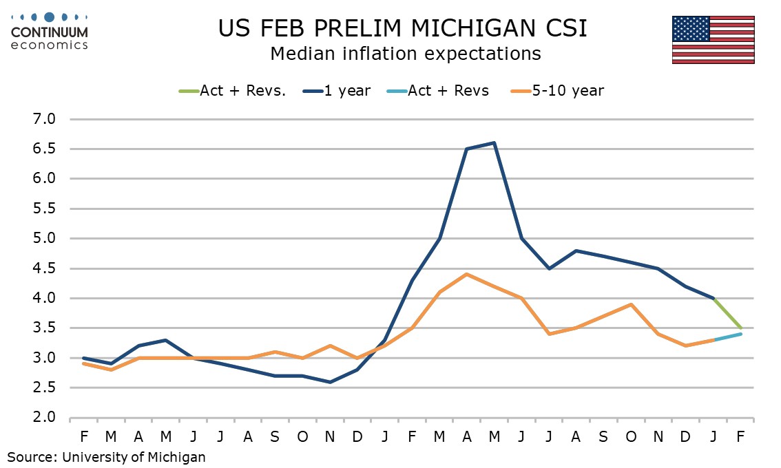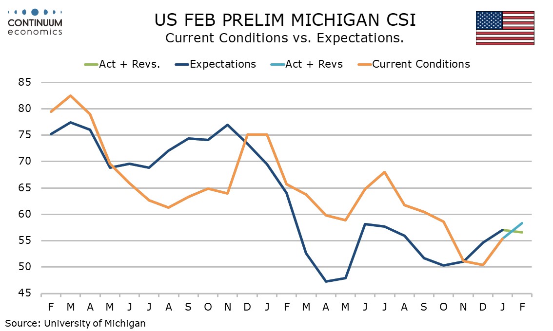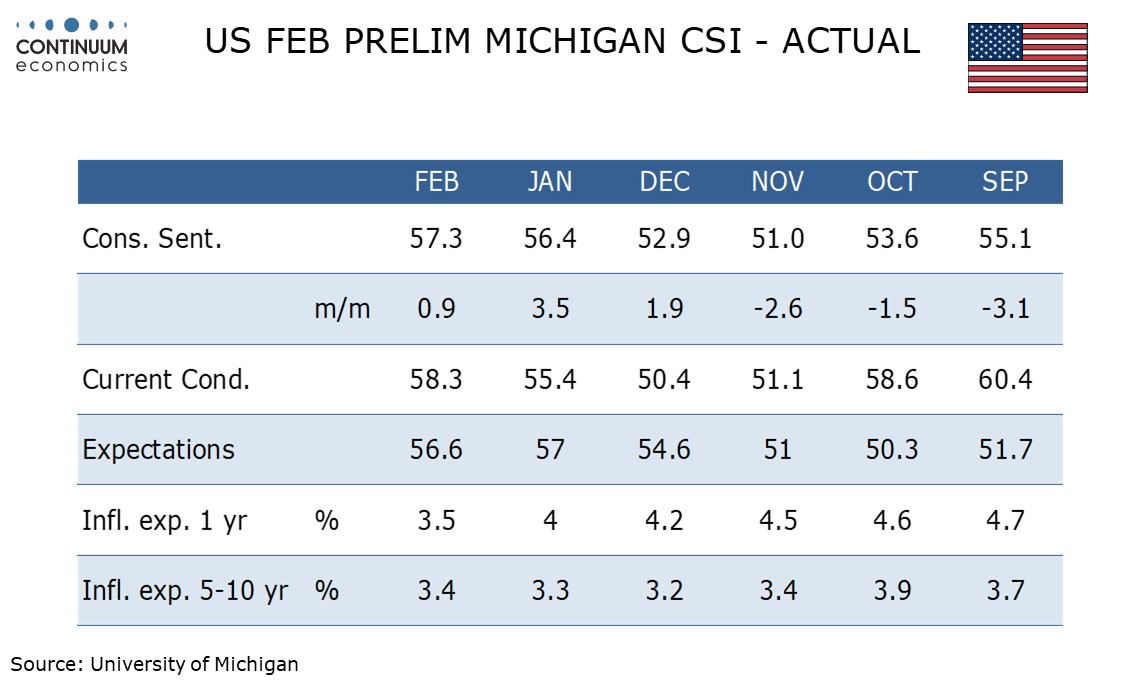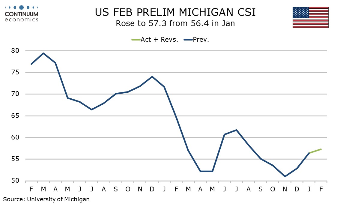 February’s preliminary Michigan CSI at 57.3 from 56.4 has seen a third straight increase to the highest level since August.