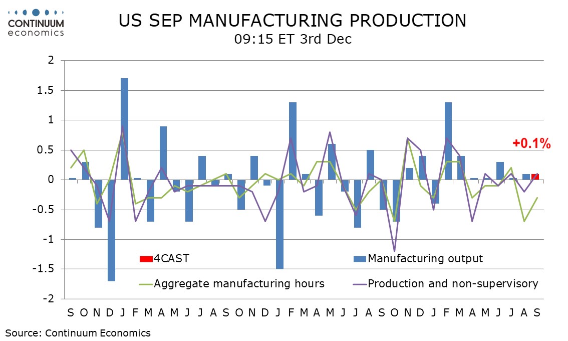 September’s non-farm payroll showed aggregate manufacturing hours worked falling by 0.3% overall but with a marginal 0.1% increase fir production and non-supervisory workers. We expect a 0.1% increase in manufacturing output to come largely from high tech.