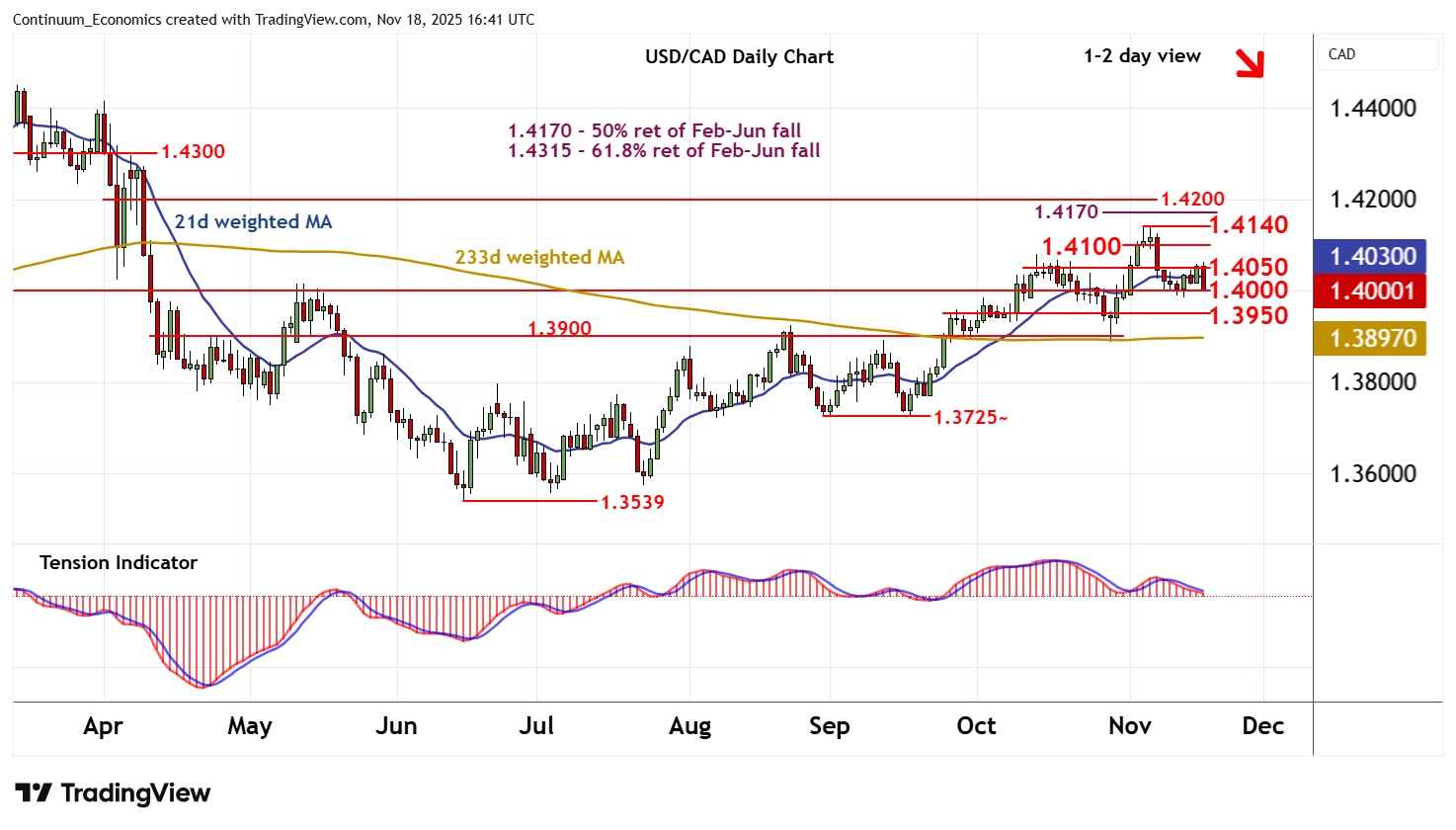 16:30 GMT - Consolidation around resistance at 1.4050 has given way to a pullback, as intraday studies turn down, with prices currently pressuring support at the 1.4000 break level. Daily readings are turning down and broader weekly charts are coming under pressure, highlighting room for further losses in the coming sessions. A break below 1.4000 will open up 1.3950. But a further close below 1.3900 is needed to turn sentiment outright negative and confirm continuation of November losses. Meanwhile, a break above 1.4050, if seen, will help to stabilise price action and give way to consolidation beneath the 1.4100 break level.