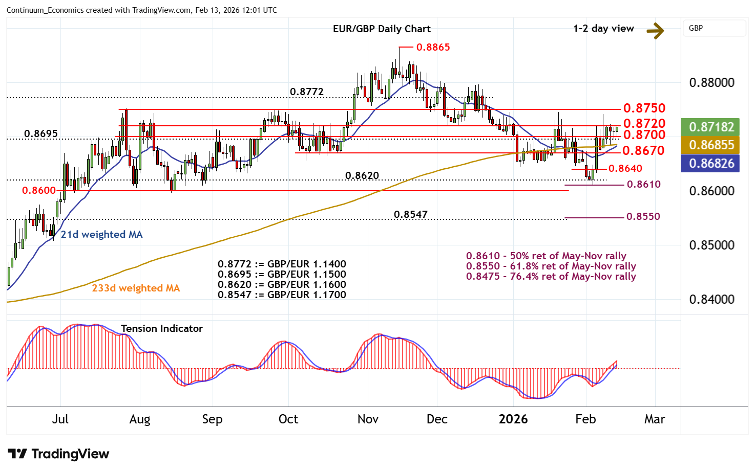 11:55 GMT - Still little change, as prices extend cautious/choppy trade within resistance at 0.8695/00 - 0.8720. Intraday studies are leaning lower and overbought daily stochastics are flattening, suggesting room for a test lower in the coming sessions. A break below 0.8695/00 will open up congestion around 0.8670. But the positive daily Tension Indicator and improving weekly charts should limit any initial tests in renewed buying interest/consolidation. Meanwhile, resistance remains at congestion around 0.8720. But a close above further congestion around 0.8750 is needed to improve sentiment and extend February gains initially to 0.8772, (GBP/EUR 1.1500).