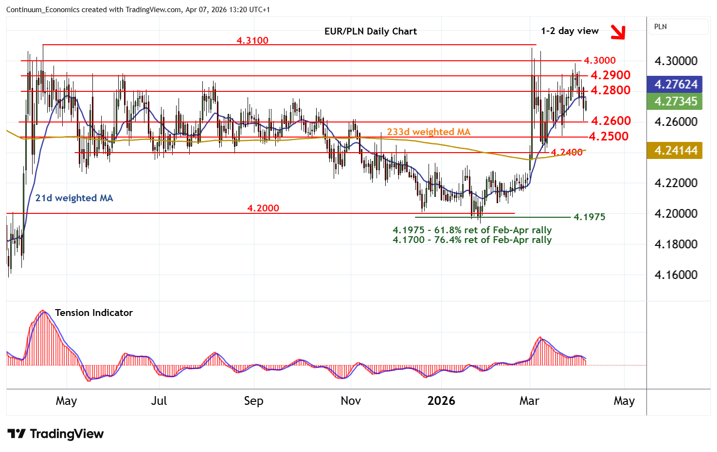 12:45 BST - The anticipated break lower has reached congestion support at 4.2600, where a sharp bounce has put prices into consolidation around 4.2700. Daily readings are under pressure and overbought weekly stochastics are unwinding, suggesting room for further losses in the coming sessions. But the positive weekly Tension Indicator and rising longer-term charts should limit any tests below 4.2600 in renewed buying interest above 4.2500. Meanwhile, resistance is lowered to congestion around 4.2800 and extends to 4.2900. This range should cap any immediate tests higher.