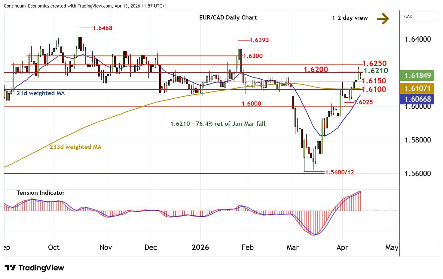 11:30 BST - The anticipated break above strong resistance at congestion around 1.6200 and the 1.6210 Fibonacci retracement has been pushed back from beneath 1.6250, as intraday studies and overbought daily stochastics turn down, with prices currently trading around 1.6185. A move down to congestion support at 1.6150 cannot be ruled out. But the rising daily Tension Indicator and positive weekly charts should limit any tests in renewed buying interest/consolidation. A close beneath here, however, would add weight to sentiment and extend losses towards 1.6100. Following cautious/corrective trade, a fresh test higher is looked for. A close back above 1.6200/10 will extend March gains towards congestion around 1.6250. However, deteriorating longer-term charts could limit any further gains in profit-taking towards 1.6300.