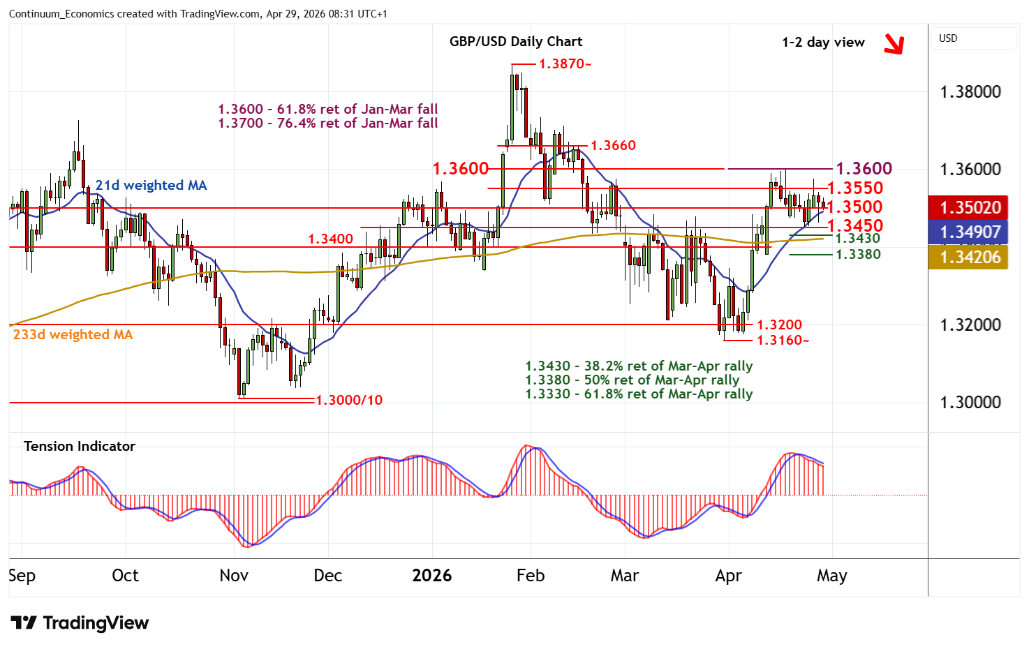 08:10 BST - Little change, as prices extend cautious trade around congestion support at 1.3500. Intraday studies are turning down and daily readings continue to fall, highlighting room for a test beneath here. Focus will then turn to 1.3450. But mixed/positive weekly charts should limit any initial tests in renewed consolidation. A break, however, will add weight to sentiment, and extend mid-April losses below the 1.3430 Fibonacci retracement towards congestion around 1.3400. Meanwhile, resistance remains at congestion around 1.3550. However, a close above 1.3600 is needed to turn sentiment positive and extend late-March gains initially towards congestion around 1.3660.
