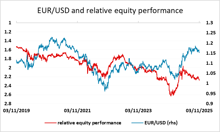 Otherwise, there is very little to focus on. Monday saw the EUR slip back to its lowest since July, once again without much obvious rationale, but the break below the 1.1540 level on Friday and the failure to recover back above it has turned the technical picture bearish. European funds who increased their USD hedges this year and led to the EUR outperformance of the old yield spread correlation are unlikely to reduce them once again despite the recent strong USD performance and the outperformance of US equities, so we wouldn’t expect a sharp EUR move lower. But for the moment the EUR is trading heavy and we could see a drift towards the 1.14 support area.