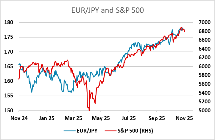 There is more of a case for a decline in EUR/JPY than EUR/USD, with JPY weakness looking increasingly hard to justify now that the new Finance minister has indicated that the recent JPY moves are “rapid and one sided”. Yields spreads and equity risk premia already suggest scope for substantial JPY gains, but EUR/JPY has recently simply been moving up with equities. An equity correction or official intervention still look like a necessary trigger for a major JPY turn, although last week’s comments from Finance minister Katayama do seem to have at least created a short term USD/JPY ceiling at 154.40, and the corrective tone to equities so far today suggests a mild JPY bid may persist.