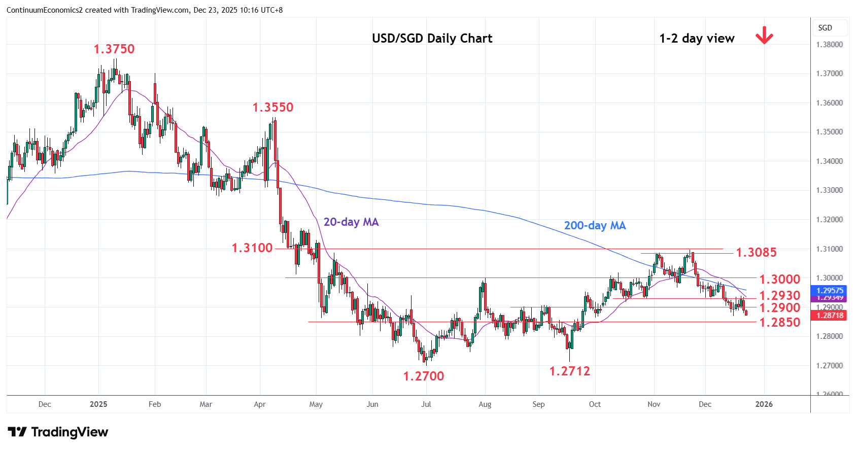 Consolidation above the 1.2900 level has given way to renewed selling pressure to retest support at the 1.2865/50 area