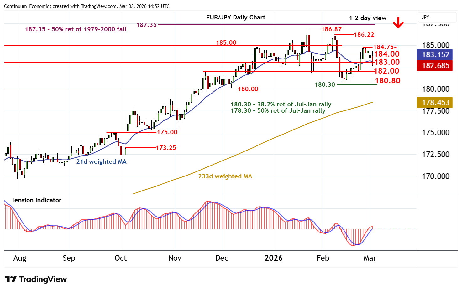 | R1 | 183.00 | * | break level | S4 | 180.30 | ** | 38.2% ret of Jul-Jan rally |