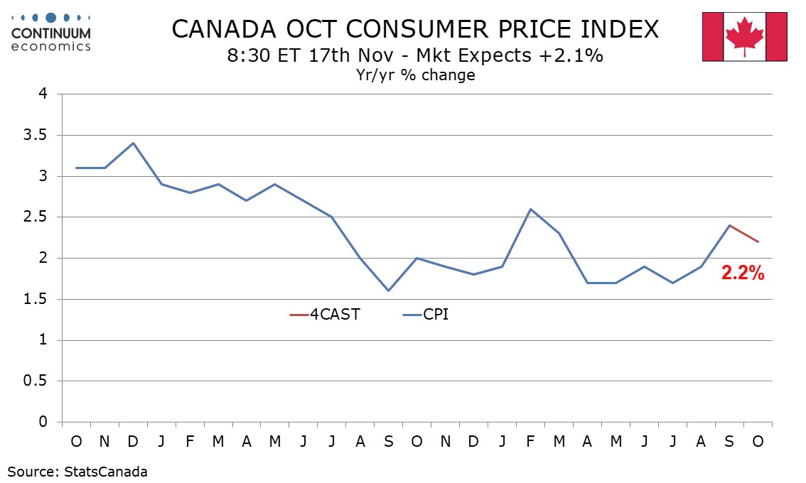 We expect October’s Canadian CPI to slip to 2.2% yr/yr from 2.4% in September, though this will remain above August’s 1.9% and a Bank of Canada forecast for Q4 of 2.0%. We expect modest slippage in the Bank of Canada’s core rates too, though they will remain above the 2.0% target.