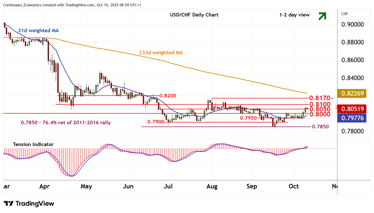 09:20 BST - The anticipated break above 0.8050 has reached 0.8075, where unwinding overbought intraday studies are prompting profit-taking and a pullback to 0.8050. Overbought daily stochastics are also flattening, suggesting room for a test beneath here. But the rising daily Tension Indicator and positive weekly charts are expected to limit losses in renewed buying interest towards congestion support at 0.8000. Following cautious trade, fresh gains are looked for. A break above congestion resistance at 0.8100 will target critical resistance at the 0.8170~ current year high of 1 August. But by-then overbought daily stochastics could prompt renewed profit-taking towards here.