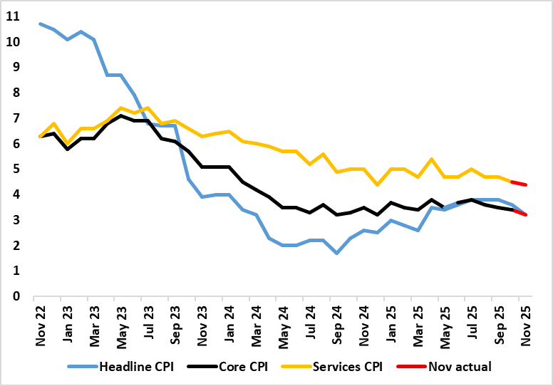 A clear downside surprise adds to the wealth of data suggesting a reining of price and cost pressures. This November result makes it more likely that the September CPI outcome will prove to be the CPI inflation peak. Indeed, although October figure fell a little less than the consensus by 0.2 ppt to 3.6%, these November numbers showed twice as large a drop to 3.2%, an eight-month low. Much was food related but the core rate still fell 0.2 ppt but to an 11-month low of 3.2% (Figure 1). After some further aberrant factors, services inflation (helped by airfares), dropped 0.1 ppt to a 10-mth low. Notably, in adjusted terms of late (Figure 2), a clear fall to rates consistent with target already seems to be occurring as far as underlying inflation is concerned, this also evident in regard to services. The data, 0.2 ppt below its expectation, clears the way for the BoE to cut tomorrow, and may not only limit dissent against lower rates but persuade some doves to call for a larger move than the likely 25 bp move.