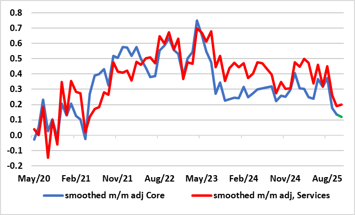 On this basis, we suggest that the underlying disinflationary process towards target is not only intact but being overlooked, justifying more than a continued “gradual and careful” withdrawal of monetary policy restriction as did four members of the MPC this month. We see 100 bp of rate cuts ahead, including an increasingly likely move this month, this outlook into 2026 helped by a fall in the headline rate to possibly just under 3% in Q1 next year.