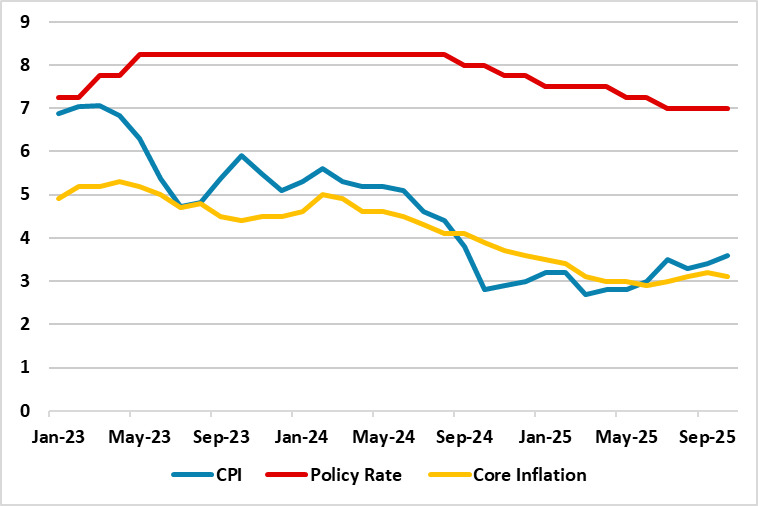 MoM prices edged up by 0.1% after surging by 0.2% in September. Annual core inflation rate slightly edged down to 3.1% in October, from a seven-month high of 3.2% in September. Despite inflation staying within the South African Reserve Bank’s (SARB) 1 percentage point tolerance band of new 3% target announced last week, we think stubborn price pressures signal the uncertainty over the inflation outlook in the upcoming months since unpredictable outlook for the global economy, increase in utility costs, and climate-related agricultural disruptions will likely continue to pressurize prices in 2026.