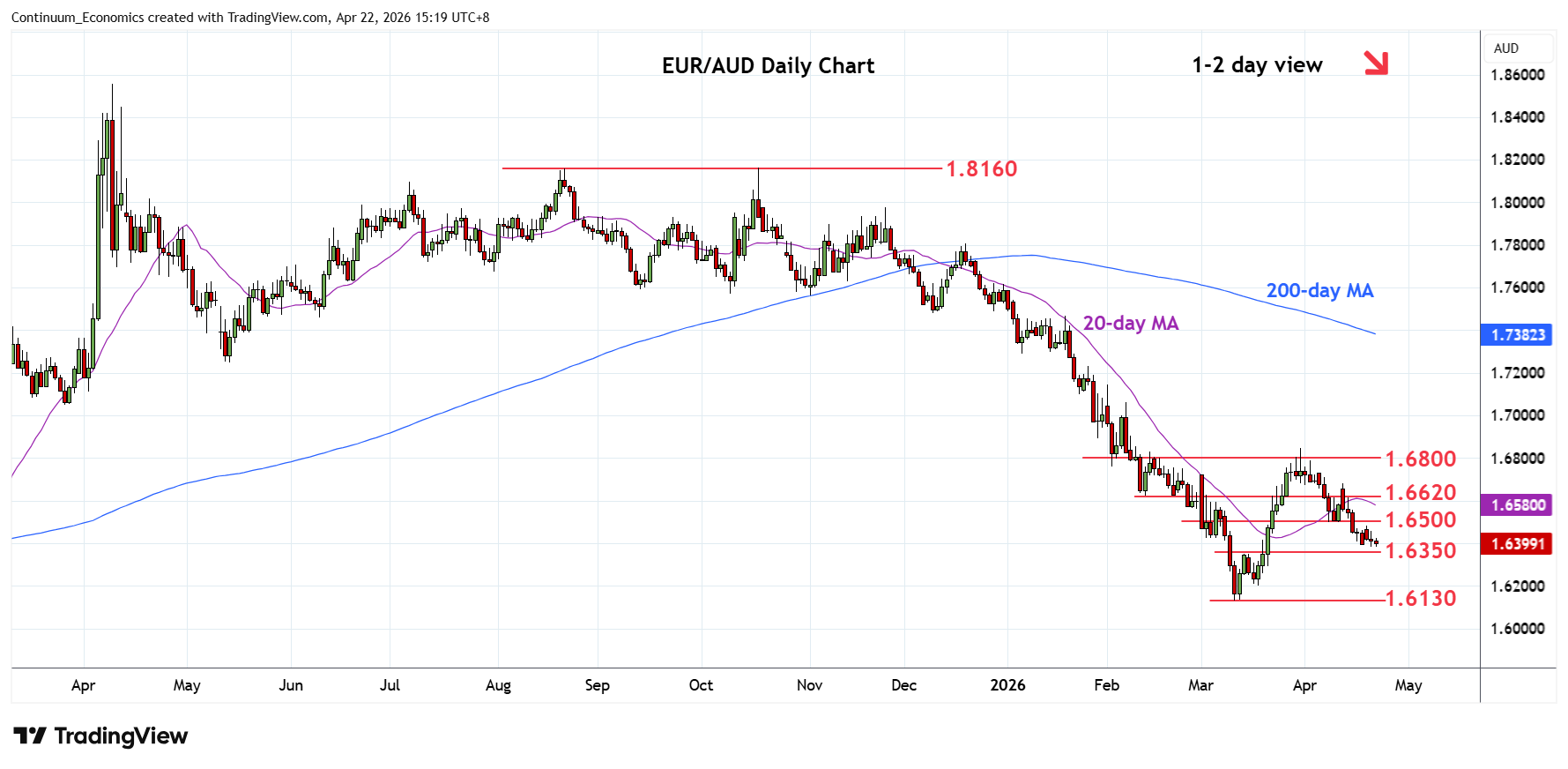07:30 GMT - Under pressure as prices extend losses from the 1.6845 March high to weigh on the 1.6400 level. Below this will open up room for deeper pullback to strong support at 1.6350, 13 March high. Break here will return focus to the downside for retest of 1.6200 level then the 1.6130, 11 March current year low. Lower still, will extend the broader losses from the April 2025 year high and see room to 1.6000 figure. Meanwhile, resistance remains at the 1.6500 level which is expected to cap and sustain the losses from 1.6845, March swing high.