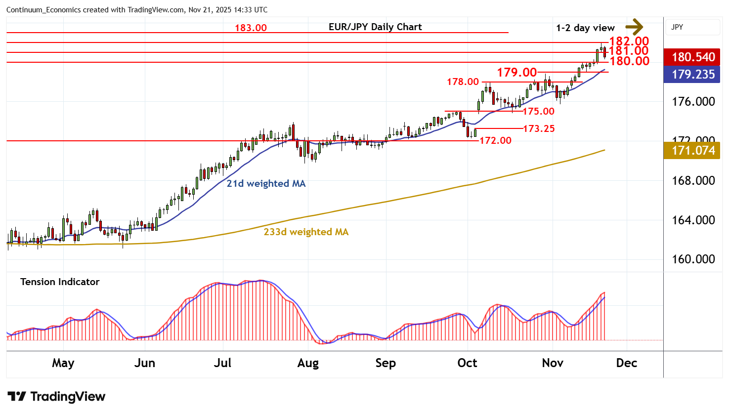 14:25 GMT - Cautious trade beneath critical resistance at 182.00 has given way to a pullback in both EUR- and JPY-driven trade, with the break below 181.00 currently trading around 180.50. Intraday studies are under pressure and overbought daily stochastics are turning down, highlighting room for further losses in the coming sessions towards 180.00. The rising daily Tension Indicator and positive weekly charts should limit any initial break in consolidation within congestion support above 179.00. Meanwhile, a close above 182.00 would improve sentiment and extend long-term gains towards 183.00.