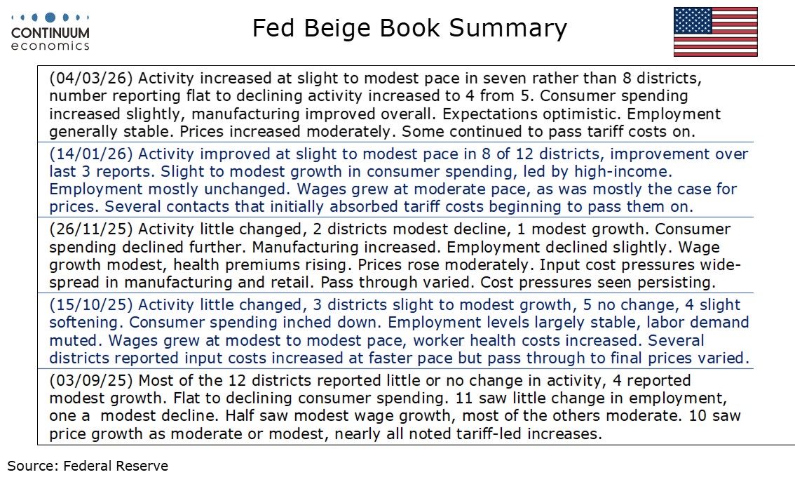 The latest Fed Beige Book is only marginally weaker than an improved January report, with positive signals on manufacturing and future expectations.