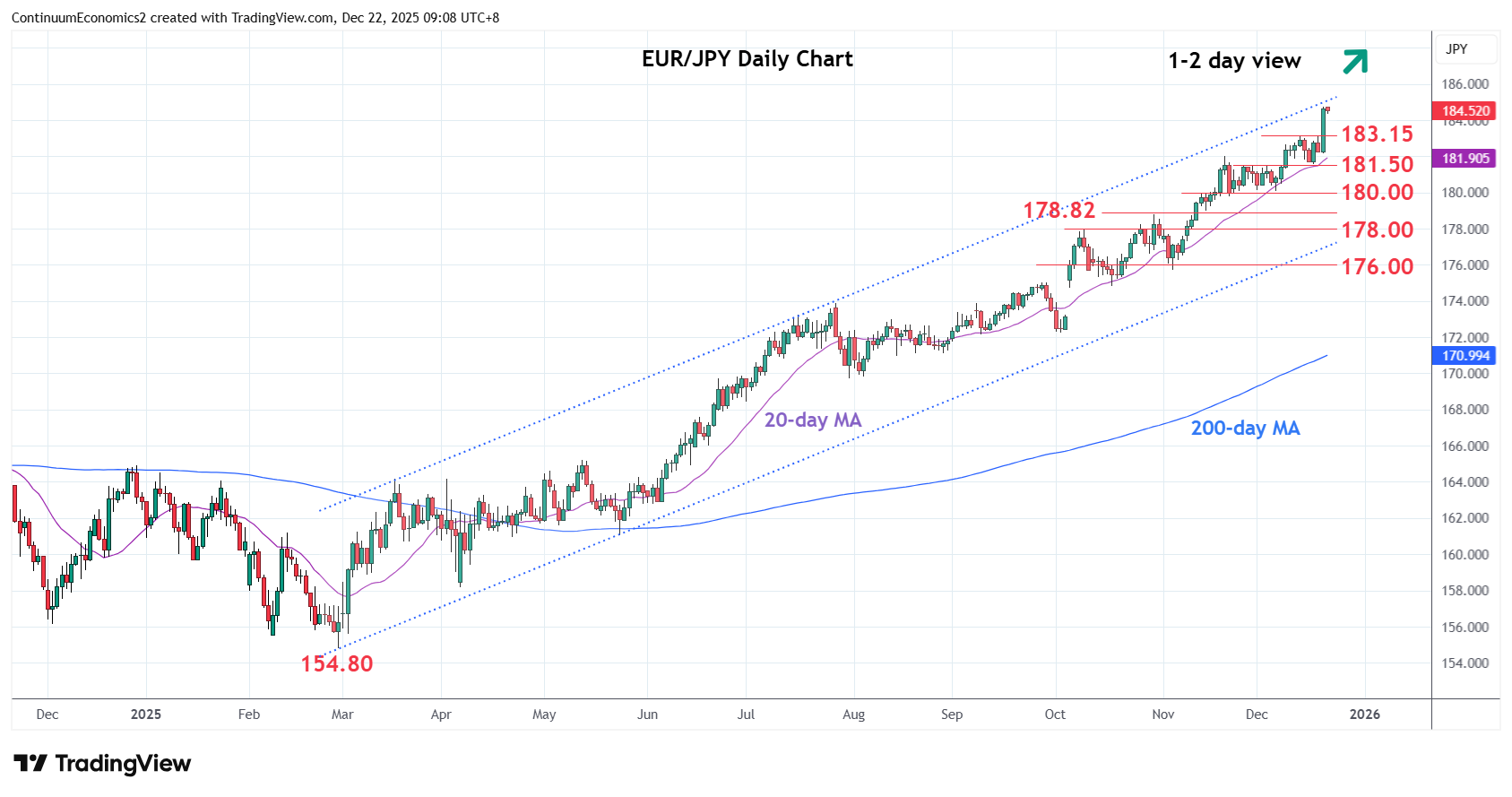 01:10 GMT - Break above resistance at 183.15 has seen rally to fresh year high at 184.75. Pause here see prices unwinding overbought intraday studies but bullish structure suggest scope for break here to further extend the underlying bull trend from the February YTD low. Clearance, will see extension to fresh multi-year high at the 185.00/186.00 congestion from August 1990. Meanwhile, support is raised tp 183.15 which should now underpin. Would take break here to ease the upside pressure and open up room for deeper pullback to strong support at the 182.00/181.50 area.