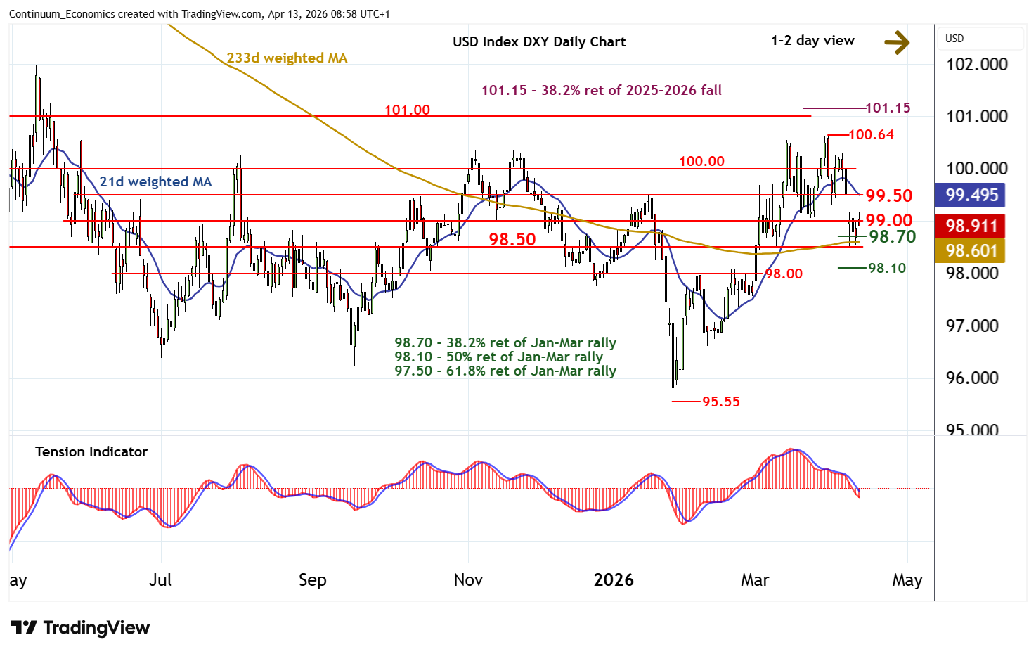 | R4 | 100.30 | congestion highs | S1 | 98.70 | ** | 38.2% ret of Jan-Mar rally | ||