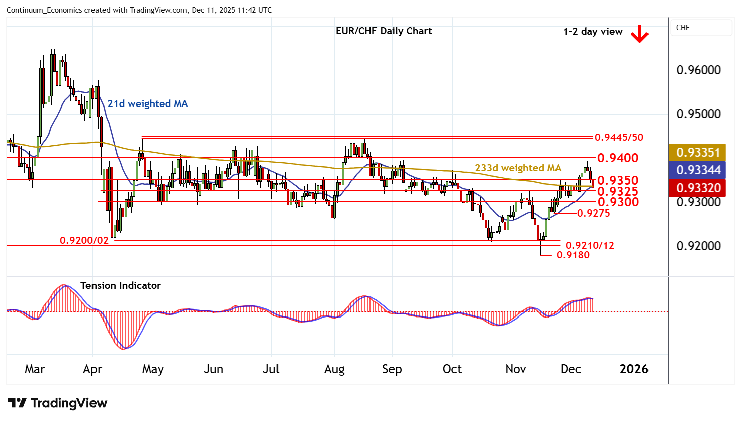 11:05 GMT - The anticipated break below 0.9350 is approaching congestion support at 0.9325. Oversold intraday studies could limit any initial tests in consolidation, before negative daily readings prompt a break. Focus will then turn to further congestion around 0.9300, but rising weekly charts are expected to limit any initial tests in fresh consolidation. Meanwhile, resistance is lowered to congestion around 0.9350. A close above here, if seen, will help to stabilise price action and prompt consolidation beneath the 0.9395 weekly high of 8 December and the 0.9400 break level.
