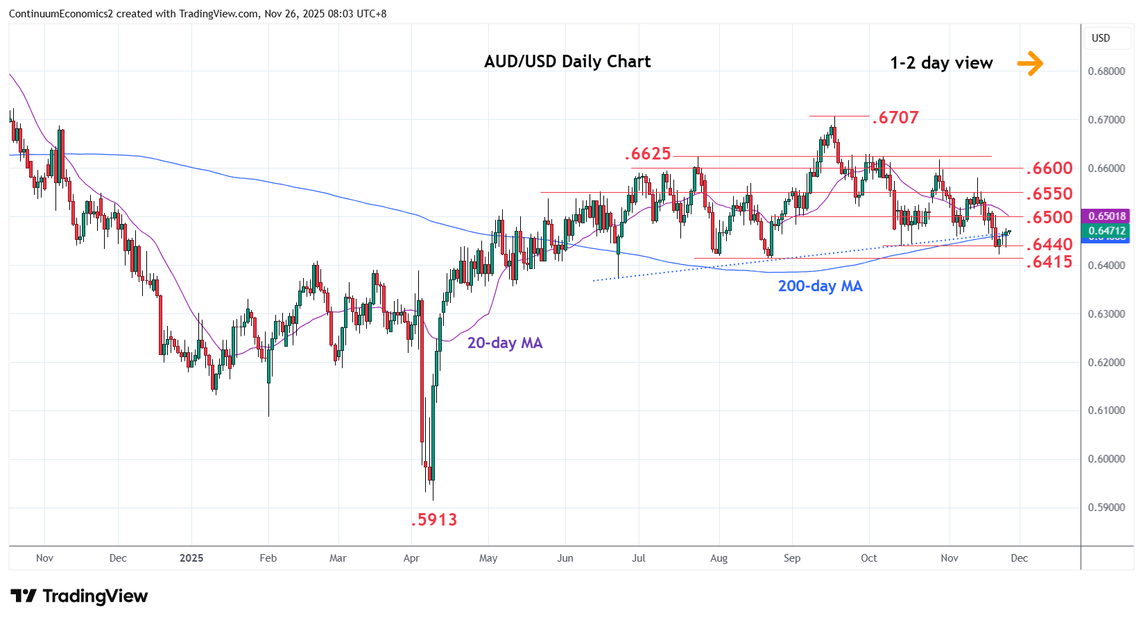 00:10 GMT - No follow-through on break of the .6440 support as prices turned up from above the .6415 support to consolidate losses from the recent .6580 swing high. Daily studies are unwinding oversold readings and see room for bounce to the .6500/20 resistance which is expected to cap. Only above here will see room for stronger corrective bounce to resistance at the .6550 congestion. Would take close below the .6440 support to see deeper pullback to retrace the April/September rally towards .6415/00 support and 38.2% Fibonacci level.