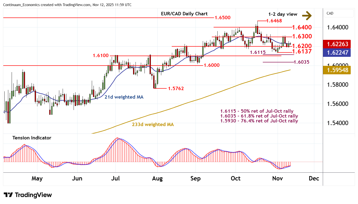 11:40 GMT - Little change, as mixed intraday studies keep near-term sentiment cautious and extend consolidation around 1.6230. Daily readings are mixed/negative, however, suggesting room for a test lower in the coming sessions. A break below congestion support at 1.6200 will add weight to sentiment and open up strong support within 1.6100/15 - 1.6135~. However, flat oversold weekly stochastics could limit any initial tests in fresh consolidation. A close beneath here would add weight to sentiment and extend mid-October losses towards the 1.6035 Fibonacci retracement. Meanwhile, resistance remains at 1.6300 and should cap any immediate tests higher.