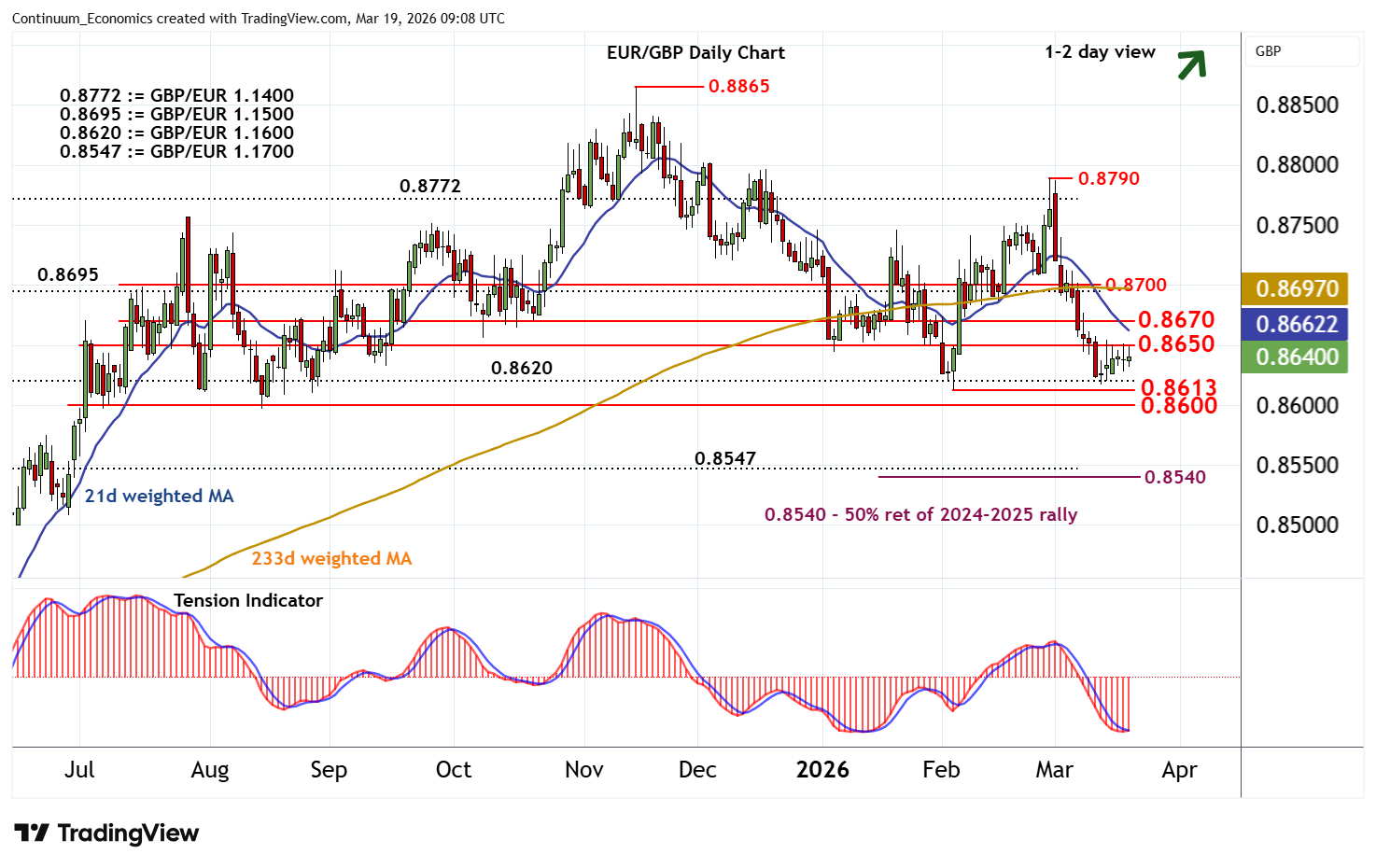 09:00 GMT - Little change, as prices extend consolidation beneath congestion resistance at 0.8650. Oversold daily stochastics are unwinding and the daily Tension Indicator is edging higher, suggesting room for a test above here. But bearish weekly charts should limit scope in renewed selling interest beneath further congestion around 0.8670. Following cautious/corrective trade, fresh losses are looked for. Critical support is at the 0.8613 current year low of 4 February and 0.8620, (GBP/EUR 1.1600). A later close beneath here will add weight to sentiment and extend November losses below congestion around 0.8600 towards 0.8540/47.