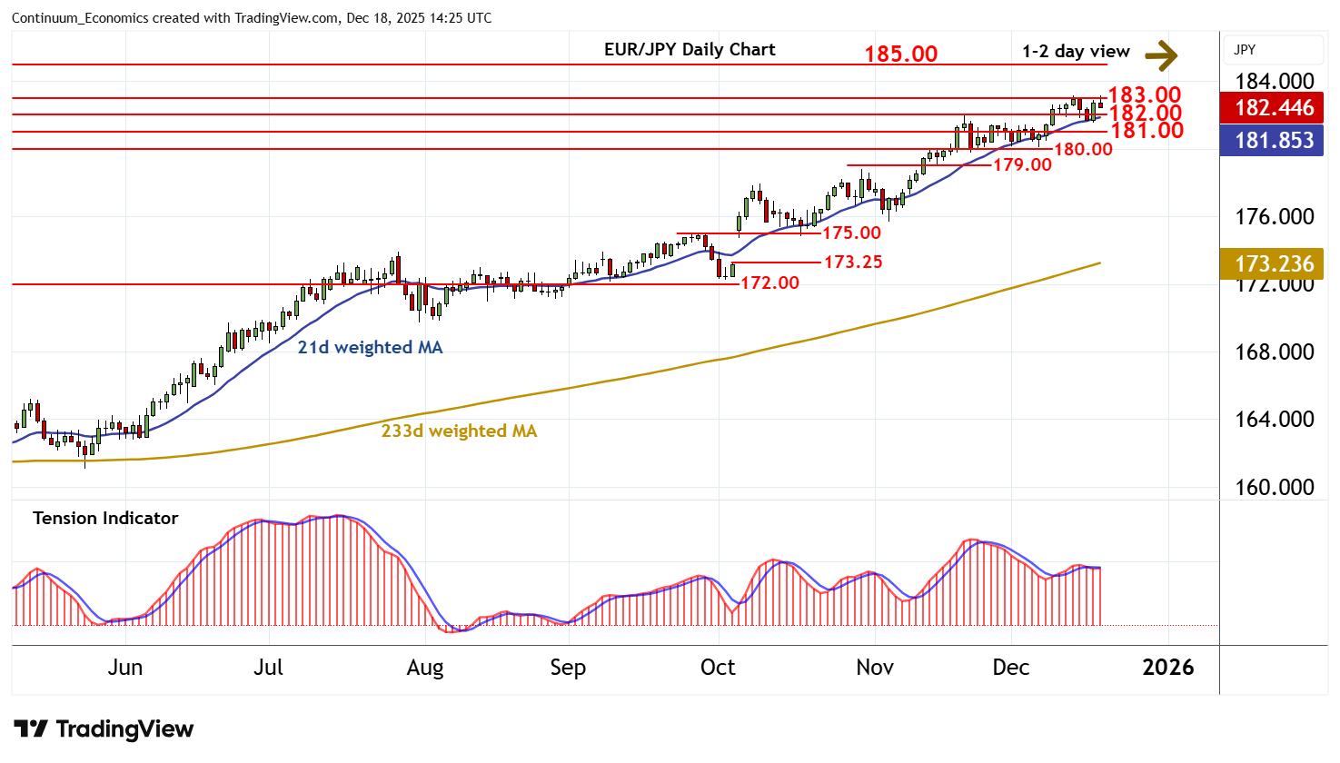 14:15 GMT - The break above 183.00 has posted a fresh multi-year high around 183.17, before settling back as intraday studies turn down to trade around 182.40. Daily readings are turning down and broader weekly charts are deteriorating, highlighting difficulty sustaining any fresh tests above 183.00/17. In the coming sessions, lower levels are looked for, with support at 182.00. A break will open up congestion around 181.00. But a close below 180.00 is needed to turn sentiment negative and confirm a near-term top in place, as renewed selling interest then targets 179.00. Meanwhile, a close above 183.00, if seen, will improve sentiment and extend long-term gains towards 185.00.