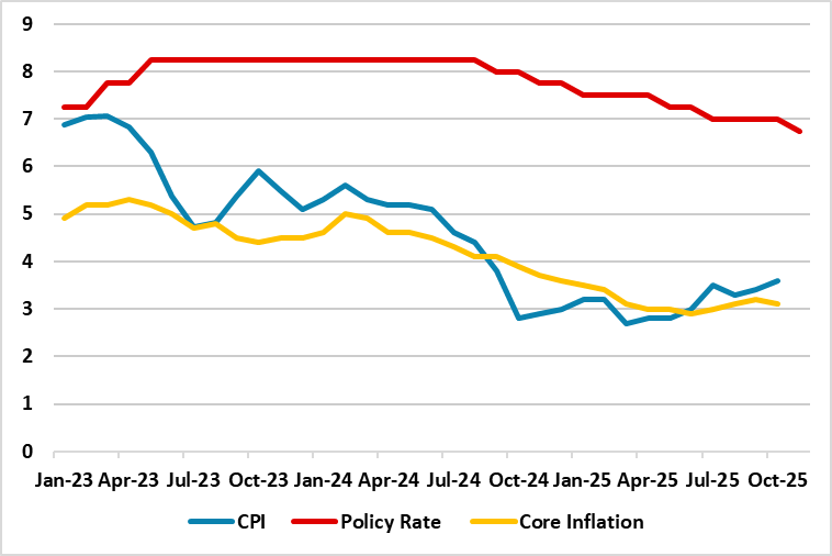 SARB’s MPC convened on November 20 announcing the last key rate decision of 2025, and reduced policy rate by 25 bps to 6.75% owing to moderate inflation, stronger ZAR, few power cuts (loadshedding) in Q3, positive macroeconomic outlook, balanced growth risks and lower oil prices. (Note: Despite annual inflation stood at 3.6% YoY in October which is above new 3% inflation anchor, it remained within the tolerance band of 1 percentage point either side of 3%). The MPC decision was unanimous.