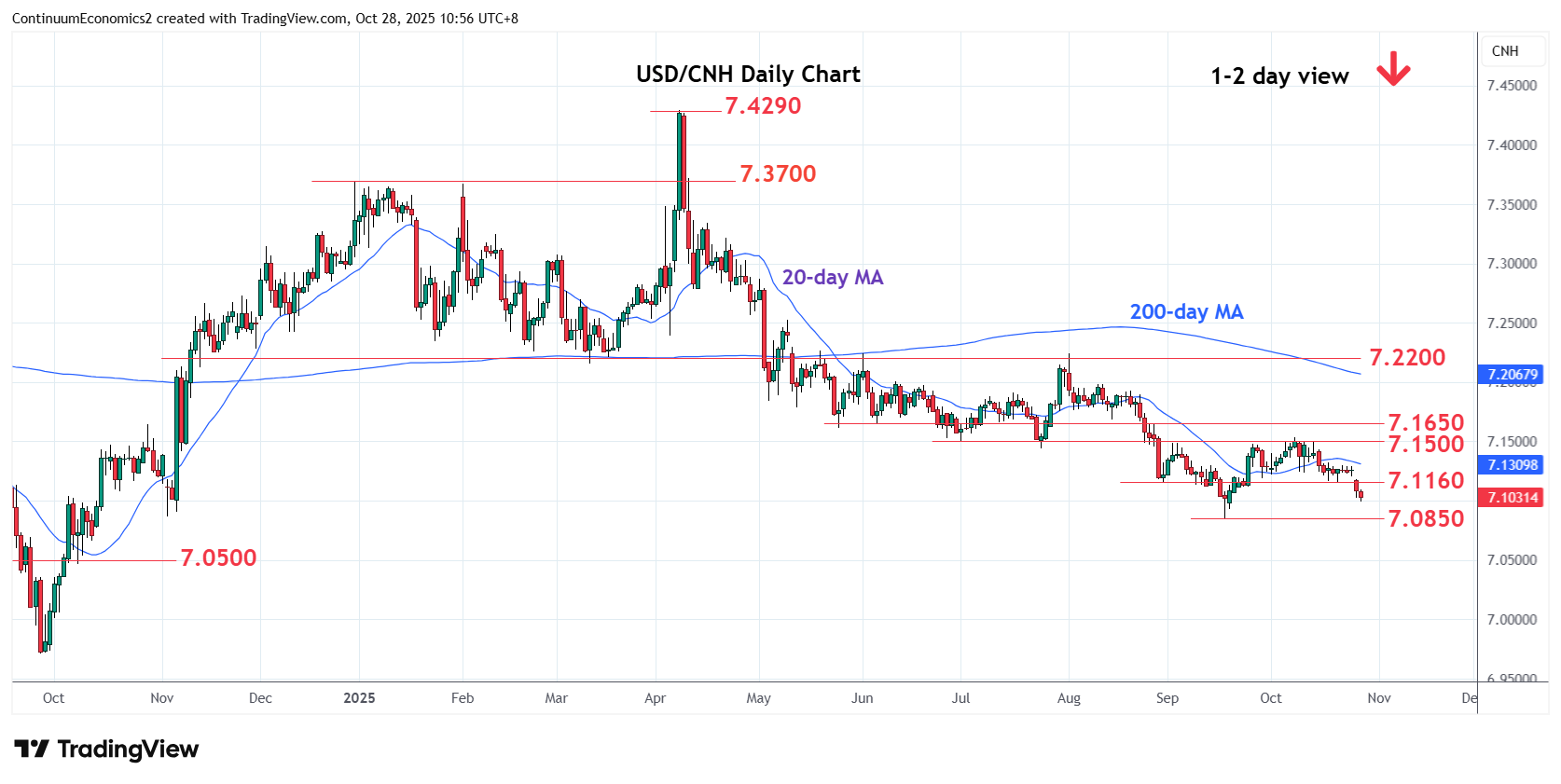 03:10 GMT - Under pressure, as prices extend pullback from the 7.1500/35 highs. Break of the 7.1160 support see prices reaching the 7.1000 congestion but focus has turned to the 7.0850, September current year low. Below the latter will further retrace the September 2024/April rally and see room to the 7.0800, 76.4% Fibonacci level. Meanwhile, resistance is lowered to the 7.1160 congestion which is expected to cap and sustain losses from the 7.1535, 8 October corrective high.