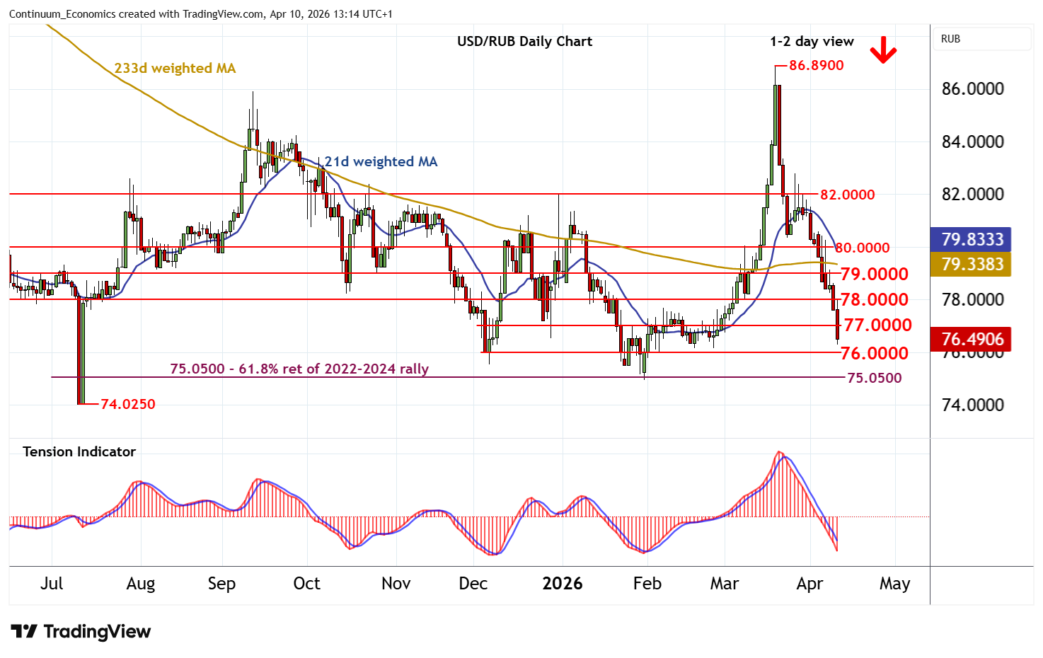 12:50 BST - Anticipated losses are extending, with prices currently pressuring levels around congestion support at 77.0000. Daily readings remain under pressure and broader weekly charts are negative, highlighting room for continuation of mid-March losses towards congestion around 76.0000. Still lower is the 75.0500 multi-month Fibonacci retracement. But already oversold daily stochastics could limit any initial tests in short-covering/consolidation. Meanwhile, resistance is lowered to congestion around 78.0000. A close above here would help to stabilise price action and prompt consolidation beneath 79.0000.
