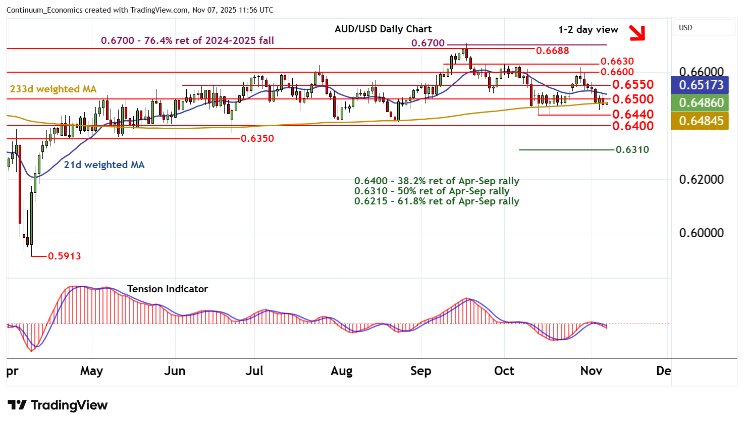 11:55 GMT - Little change, as mixed intraday studies keep near-term sentiment cautious and extend consolidation beneath congestion resistance at 0.6500. Daily readings are negative and broader weekly charts are mixed/negative, highlighting room for a test lower in the coming sessions. Support remains down to the 0.6440 monthly low of 14 October. But already oversold daily stochastics should limit any initial tests in consolidation. A close beneath here, however, will add weight to sentiment and extend mid-September losses initially to congestion around 0.6400. Meanwhile, congestion around 0.6550 should cap any immediate tests above 0.6500.