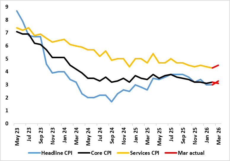 What are energy induced price rises are now very evident, most notably in PPI data as well as the more closely watched CPI figures. Thus after a stable 3.0% (a 10-mth low) February’s headline – matching the consensus, headline CPI jumped to 3.3% in March. Services, however, rose from 4.3% a four-year low (Figure 1) to .5% on the back if what may have been early Easter induced airfare rises, but the core still edged down a notch due to lower non-energy good inflation (Figure 1). The markedly and relatively greater surge in diesel relative to unleaded fuel warrants a hardly surprising upgrade to the price outlook for the rest of the year. On the basis of our baseline 4-8 week war thinking, we see the headline CPI falling back for in April before moving back higher in May in Q4 but then dropping back to end the year to 2027 at just over 2.5% but with the 2027 picture little changed, not least as tightening financial condition bite and soft wage pressures persist (Figure 2).