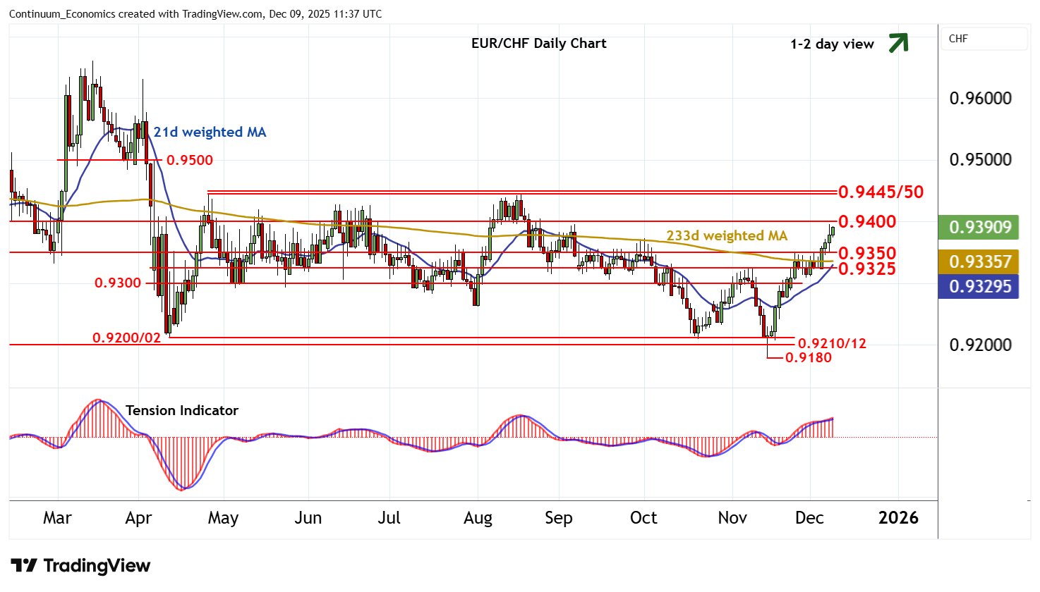 10:55 GMT - Cautious trade, as flat overbought daily stochastics prompt consolidation beneath congestion resistance at 0.9350. The daily Tension Indicator is rising and broader weekly charts are positive, highlighting room for further gains in the coming sessions. A break above 0.9350 will extend mid-November gains towards critical resistance at the 0.9445/50~ range highs from April-August. But already overbought daily stochastics could limit any initial tests in consolidation. Meanwhile, support is raised to congestion around 0.9350 and extends to 0.9325. This range should underpin any immediate setbacks.