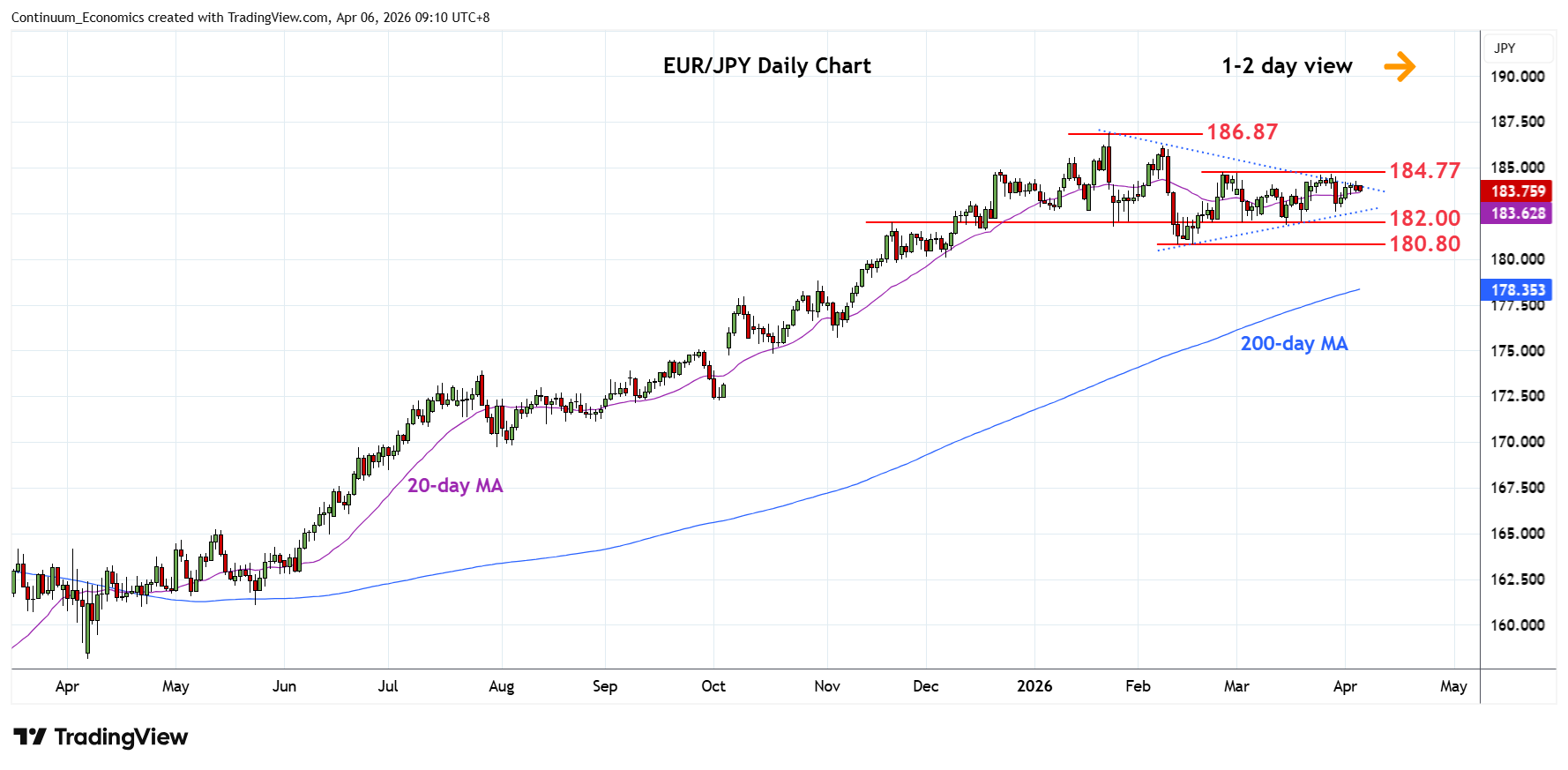 01:10 GMT - Higher in consolidation from the 182.60 low as prices extend choppy trade within the 182.00/184.77, 6-week range. Daily studies remain mixed and suggest further ranging action below the 184.65/184.78 recent highs. Would take break here and the 185.00 level to return focus to the upside for retest of the 186.00 level and 186.87 January current year high. Meanwhile, support at the 182.60/182.00 area now underpin. Would take break here to expose the 180.80 February current year low to retest and see scope to extend the January losses.