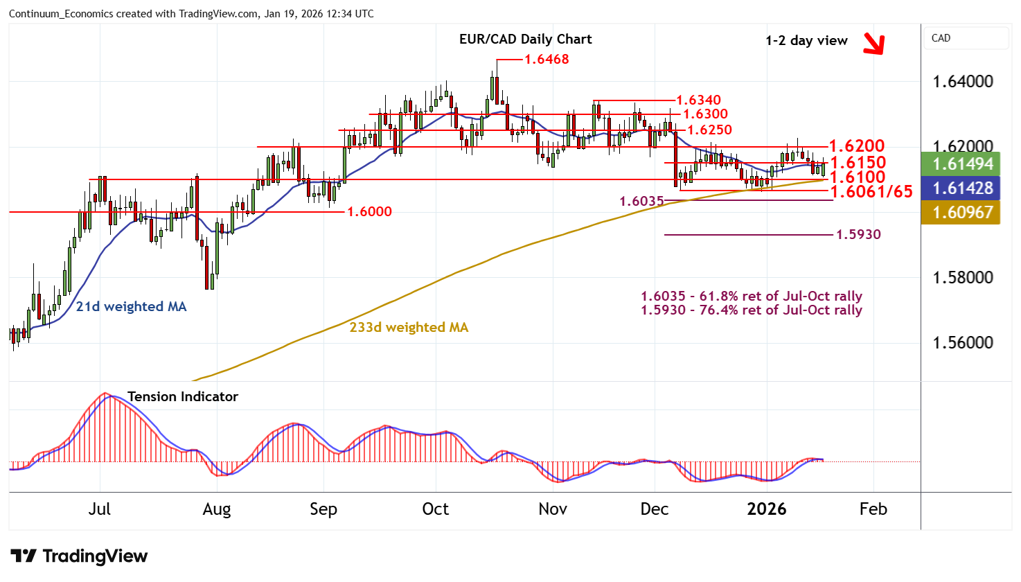 11:55 GMT - The retest of congestion support at 1.6100 has bounced in choppy trade, with prices currently balanced around congestion resistance at 1.6150. Rising intraday studies highlight room for a test above here. But negative daily readings are expected to limit scope in renewed selling interest beneath congestion around 1.6200. In the coming sessions, a test below 1.6100 cannot be ruled out. Focus will turn to critical support at 1.6061/65, where rising weekly charts could prompt fresh consolidation. Deteriorating longer-term charts, however, point to a later break and continuation of October losses, initially to the 1.6035 Fibonacci retracement.