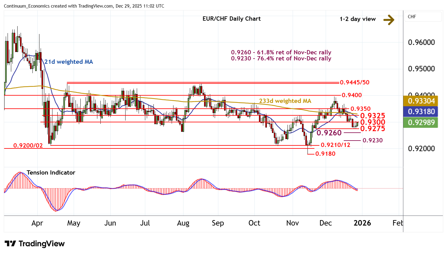 10:50 GMT - Little change, as prices extend cautious trade within the 0.9275 - 0.9300 range. Intraday studies are mixed/positive and oversold daily stochastics are ticking higher, suggesting potential for a test above congestion resistance at 0.9300. But the bearish daily Tension Indicator and deteriorating weekly charts are expected to limit initial scope in renewed selling interest beneath 0.9325. Following cautious trade, fresh losses are looked for. A later break support at the 0.9275 low of 21 November will open up the 0.9260 Fibonacci retracement. But already oversold daily stochastics could limit any initial tests in consolidation, before bearish weekly charts extend December losses towards the 0.9230 retracement.