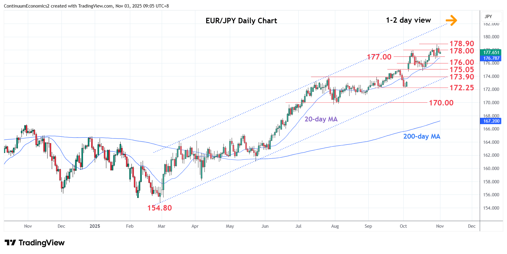 01:15 GMT - Lower in range as prices consolidate gains to fresh year high just below the 178.90 high of September 1990. Consolidation here see prices unwinding overbought intraday and daily studies but further gains cannot be ruled out. Higher will further extend gains within the February bull channel and see room to target the 180.00 figure. However, overbought daily and weekly studies caution corrective pullback with support raised to the 177.00/176.62 area. Break here will see room for deeper pullback to strong support at the 175.00/174.00 area.