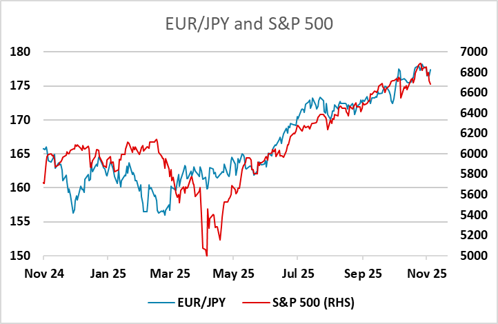 A weak University of Michigan consumer confidence number has given the USD a renewed push lower, with European currencies initially the main beneficiaries. The softer equity market this afternoon suggests to us that the JPY ought to be benefiting from the USD decline, but there look to be some technical corrective pressures on JPY crosses into the end of the week. Even so, EUR/JPY looks to be closing in on the retracement target from the move down from the highs in the 1.7760-178 region, and we would look for the JPY to rally from there.