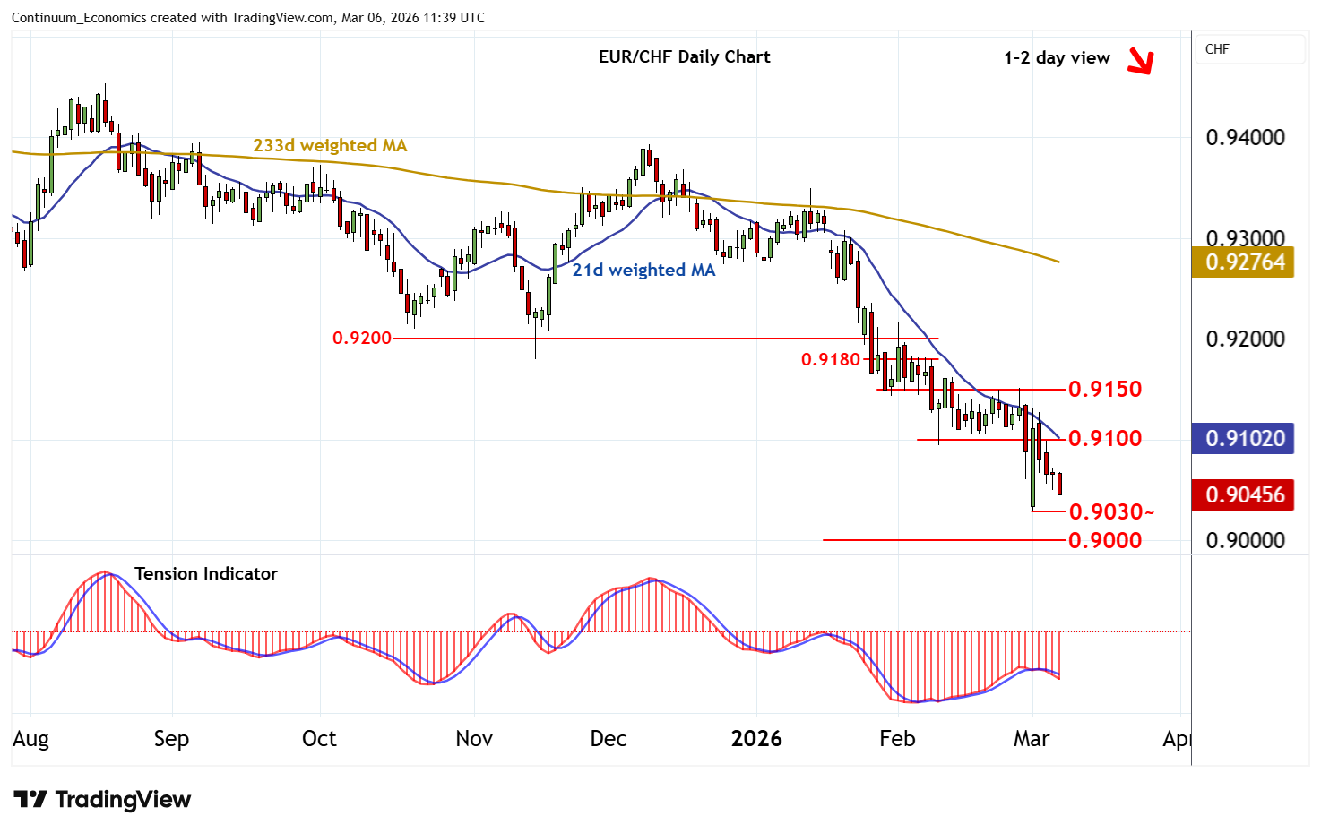10:50 GMT - Little change, as prices edge lower following consolidation around 0.9050. Both daily and weekly charts are under pressure, highlighting room for further losses in the coming sessions. However, a close below critical support at the 0.9030~ current year low of 2 March is needed to turn sentiment negative and extend long-term bear trends, initially to psychological support at 0.9000. Meanwhile, resistance remains up to 0.9100, and should continue to cap any immediate tests higher.
