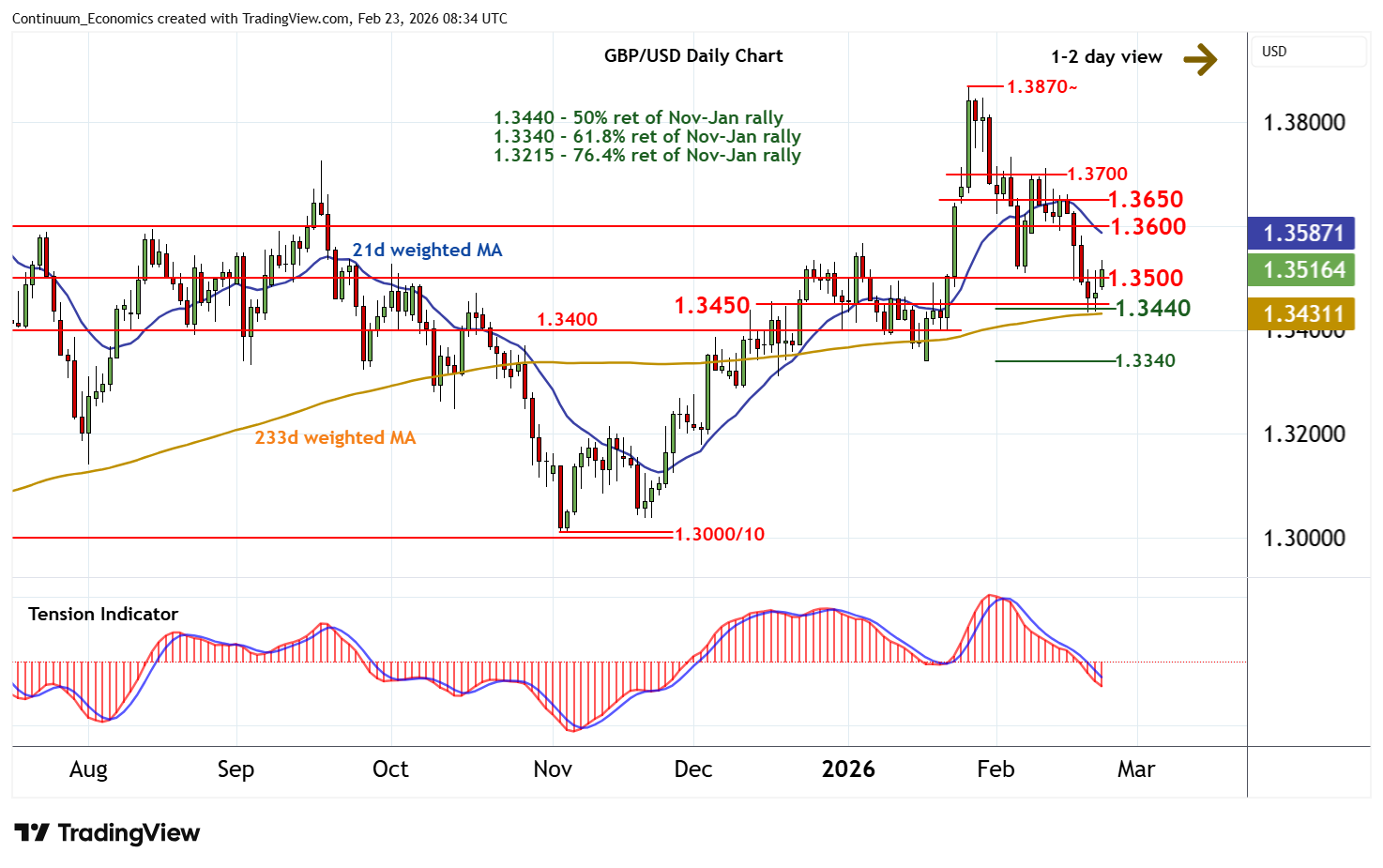 08:10 GMT - Consolidation following the test of support within the 1.3440 Fibonacci retracement and congestion around 1.3450 is giving way to a bounce, as intraday studies turn higher, with prices currently balanced in fresh consolidation above 1.3500. Oversold daily stochastics are ticking higher, suggesting room for further tests higher. But the bearish daily Tension Indicator and negative weekly charts should limit scope in renewed selling interest beneath congestion resistance at 1.3600. Following cautious/corrective trade, fresh losses are looked for. A later close below 1.3440/50 will add weight to sentiment and extend late-January losses towards congestion around 1.3400. Continuation towards the 1.3340 retracement cannot be ruled out.