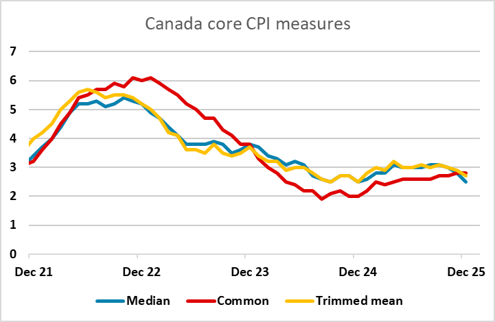 Canadian CPI was net broadly as expected, with the headline stronger than consensus at 2.4% y/y but the median weaker than expected at 2.5%, with the other BoC core measures in line with consensus. USD/CAD had a little dip but the decline was brief and it is back to pre-data levels at 1.3880. Most pairs remain little changed and not much action is likely unless we have some news on Greenland given the US holiday.