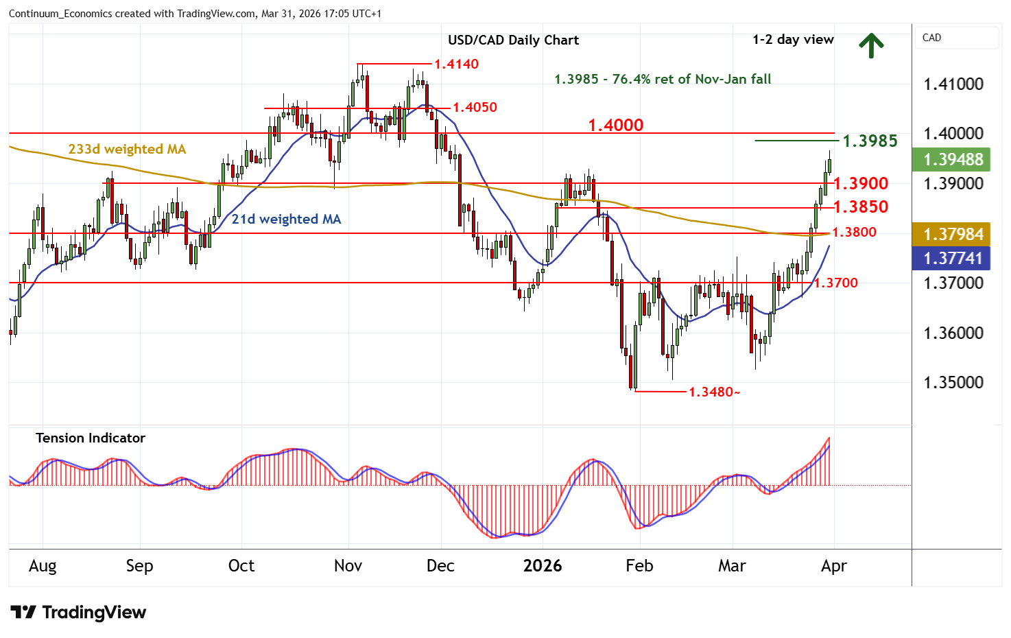 16:20 BST - Little change, as prices extend January gains to fresh 2026 year highs at 1.3965~. The positive daily Tension Indicator highlights room for a test of strong resistance at the 1.3985 Fibonacci retracement and congestion around 1.4000. But flat overbought daily stochastics could limit any initial tests in profit-taking, before rising weekly charts extend gains still further. Meanwhile, support is raised to congestion around 1.3900. An unexpected break will turn sentiment neutral and give way to consolidation around further congestion at 1.3850.