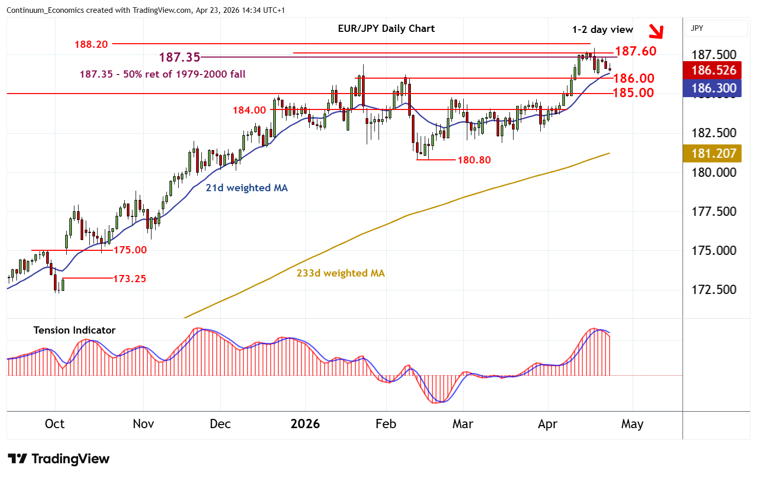 14:25 BST - Still little change, as cautious trade gives way to a fresh drift lower. Intraday studies are under pressure and daily readings remain negative, highlighting room for a pullback towards support at congestion around 186.00 and the 186.25 low of 20 April. However, rising weekly charts should limit any deeper reactions, if seen, in consolidation above 185.00. Meanwhile, resistance remains at the 187.35 multi-year Fibonacci retracement and extends to the 187.60 high of August 1990. But a close above the 188.20~ multi-year high of May 1990 is needed to turn sentiment positive and confirm continuation of long-term gains.
