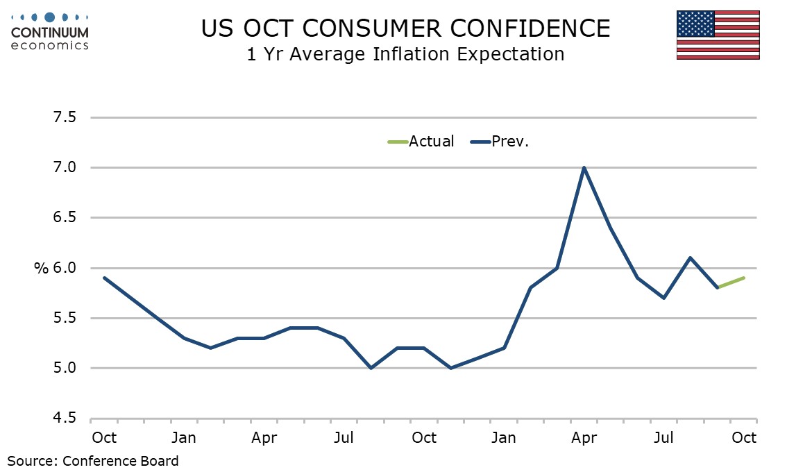The Conference Board’s Consumer Confidence Index at 94.6 in October is slightly stronger than expected and down from 95.6 in September only because September was revised up from 94.2. Labor market conditions are slightly improved and inflation expectations slightly higher.