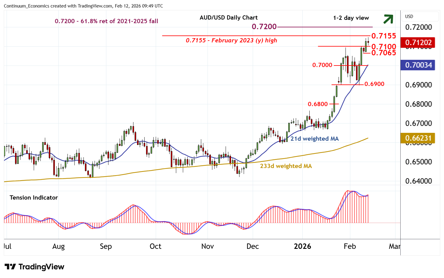 09:30 GMT - Prices have posted a fresh 2026 year high around 0.7145, before settling lower into consolidation above 0.7100. Intraday studies are under pressure and rising daily stochastics are flattening, suggesting potential for a test beneath here. But the positive daily Tension Indicator and positive weekly charts should limit scope in renewed buying interest above the 0.7065 lows from 10-11 February. A close beneath here, if seen, will add weight to sentiment and prompt a deeper correction towards congestion around 0.7000. Following cautious trade, fresh gains are looked for. But a break above the 0.7155~ year high of February 2023 is needed to turn sentiment positive and open up strong resistance at the 0.7200 Fibonacci retracement.