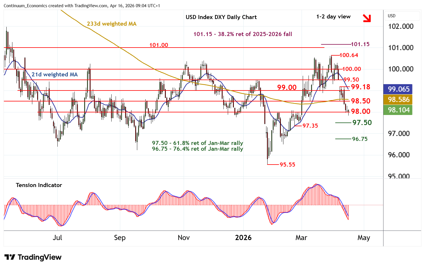 | R2 | 99.00/18 | ** | congestion; 8 Apr high | S3 | 97.35 | * | 23 Feb (w) low | |