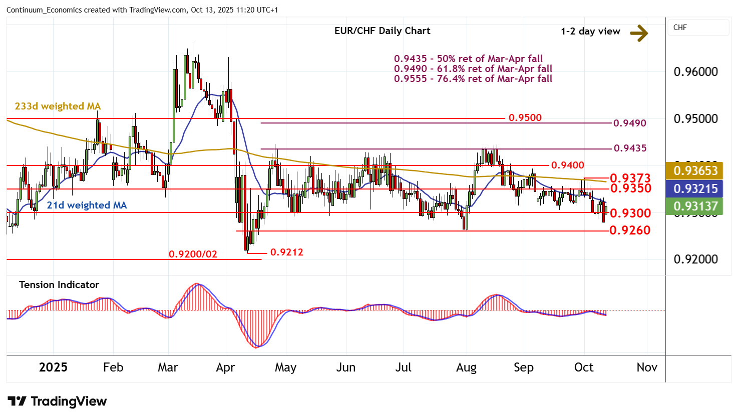 11:00 BST - The break below 0.9300 has bounced smartly from 0.9280, as intraday studies turn higher, with prices once again trading in choppy trade above 0.9300. Daily stochastics are edging higher, suggesting potential for a move higher towards congestion resistance at 0.9350. But the bearish daily Tension Indicator and mixed/negative weekly charts are expected to limit any tests in renewed selling interest. Following cautious/choppy trade, fresh losses are looked for. A later break back below 0.9300 will add weight to sentiment and extend mid-August losses towards 0.9260.